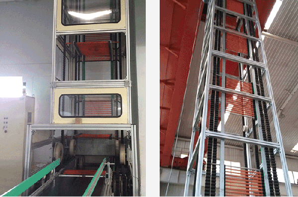 提升機是通過垂直方向的上、下通道完成對物品高度方向的升、降輸送,設(shè)備由物品提升的托板(或鏈板)、軌道、提升機構(gòu)和其它輔助設(shè)備構(gòu)成。通常提升機分為往復(fù)式提升機、連續(xù)式提升機、螺旋式提升機等。