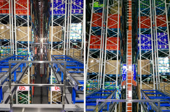 雙深位堆垛機(jī)配合雙深位貨架,與單深位堆垛機(jī)形式相比,節(jié)省空間,提高了存儲率。適用于貨物品種相對單一,出入庫效率高的情況。